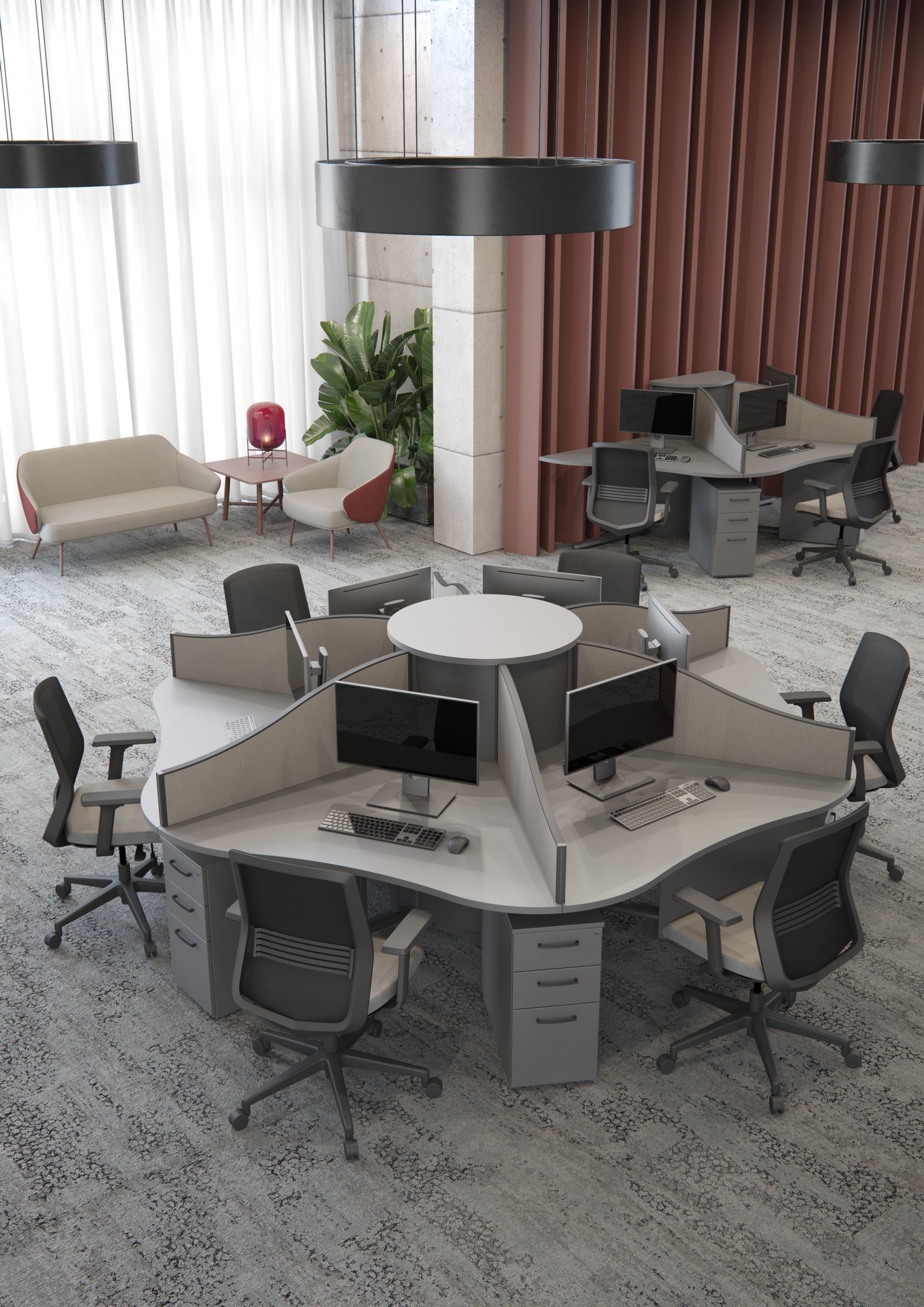Call Centre offers a highly functional solution, supported by a full steel sub-frame, offering significant levels of strength and stability. The product features a central hub capable of housing complex, high capacity cable installations that can be easily accessed via removable steel panels. The system is practical, flexible and delivers multiple workstations in clusters for improved communication.