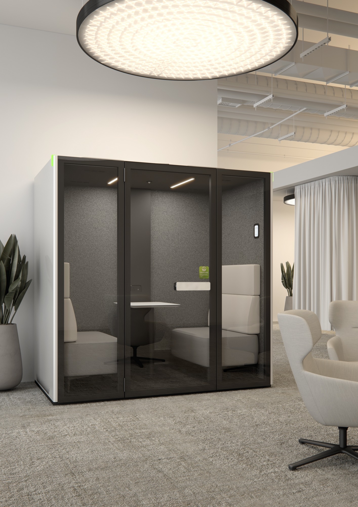 Host One and Two are exciting modular acoustic pods that embrace the rapidly changing landscape of the workplace. Host creates a walk-in sound absorbing work and privacy area engineered to reduce noise by up to 28.9 decibels. It combines sleek, stylish exterior lines with perfectly painted pressed steel, laminated safety glass and a host of internal features including an almost silent air circulation and air purifying system, motion sensitive LED lighting, touch control panel, exterior occupancy lights, power and USB charging points. Together, these combine to offer a soundproof, distraction free space.
