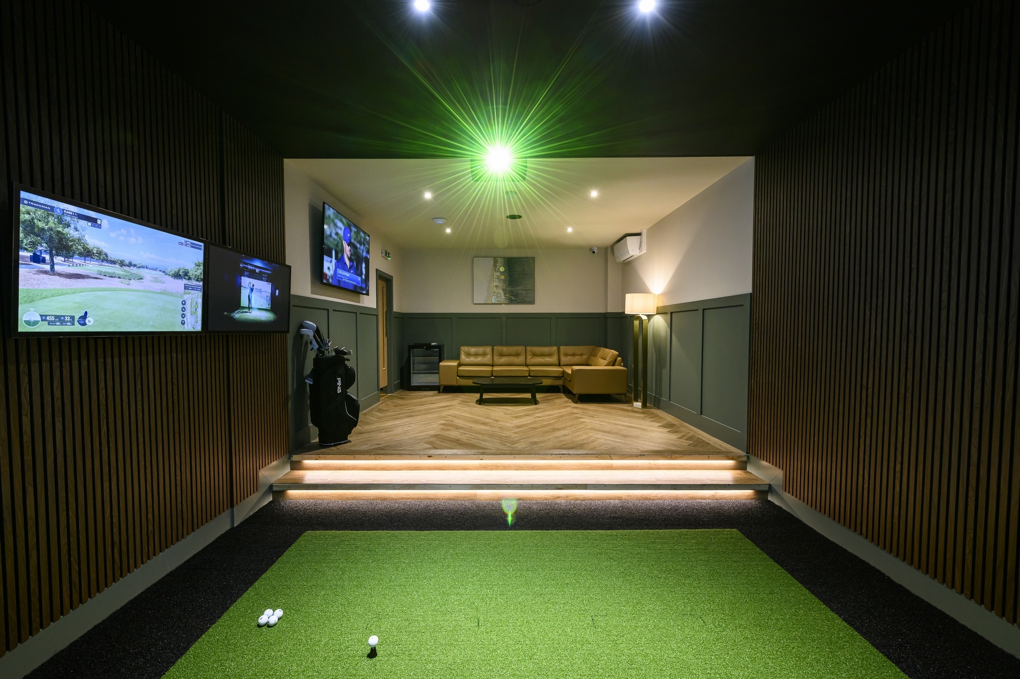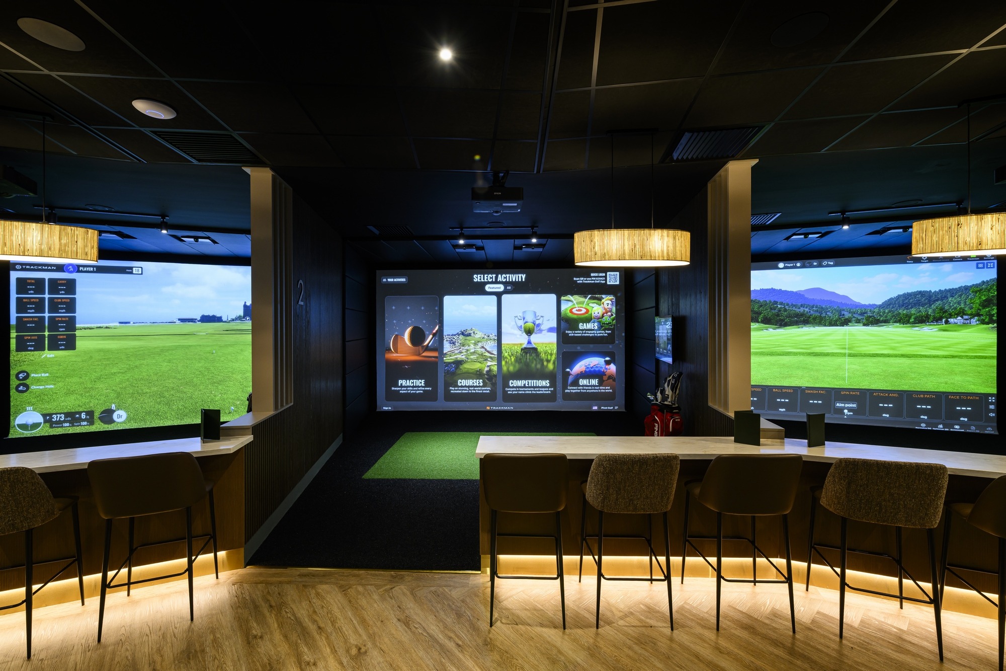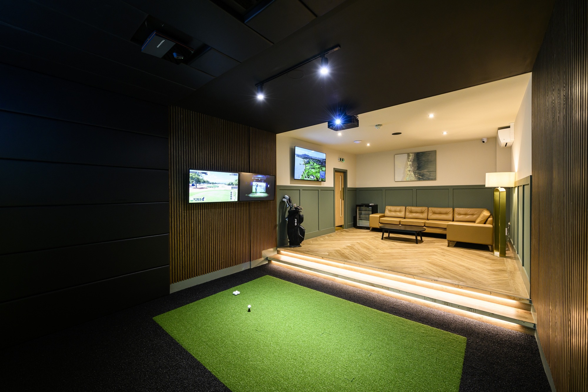 At the heart of the space are five state-of-the-art simulator bays, providing access to over 480 courses worldwide alongside advanced ball and club tracking technology. The considered layout ensures each bay feels immersive yet open, accommodating both private coaching sessions and group play. A dedicated viewing area, featuring herringbone flooring, Pablo stools, Kouch soft seating and Dalton modular seating, adds warmth and sophistication while subtly elevating the overall aesthetic.