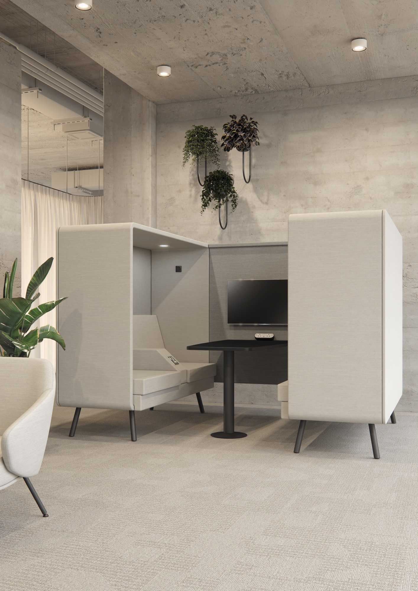 Media wall connects two Retreat booths together to form a uniting space for meetings